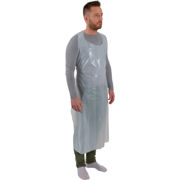 Kertakäyttöinen muoviesiliina, jossa niskalenkki ja taakse solmittavat vyötärönauhat.