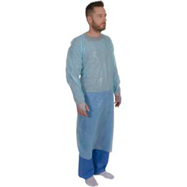 Kertakäyttöinen muovinen esiliina, jossa pitkät hihat ja peukaloaukot, niskalenkki ja taakse solmittavat vyötärönauhat.