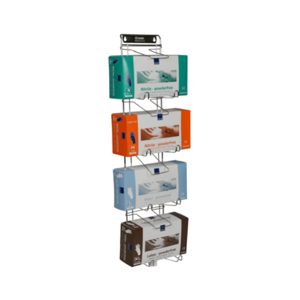 Ruostumattomasta teräksestä valmistettu teline erilaisille rasioille; soveltuu mm. käsine-, kasvopyyhe- ja esiliinarasioille. Voidaan autoklavoida.