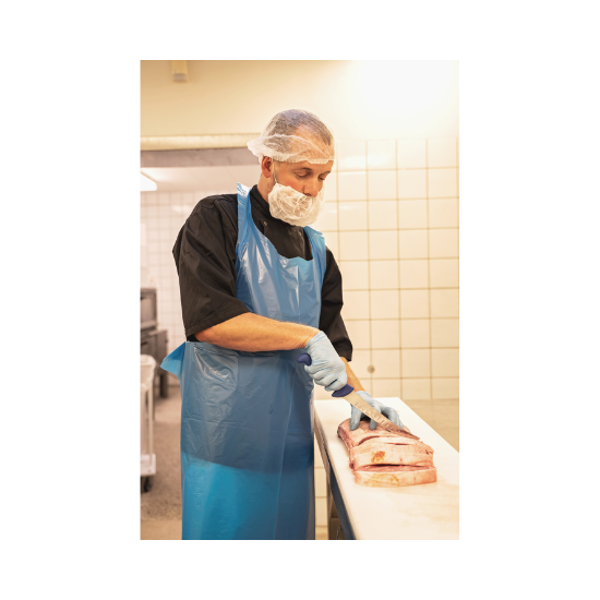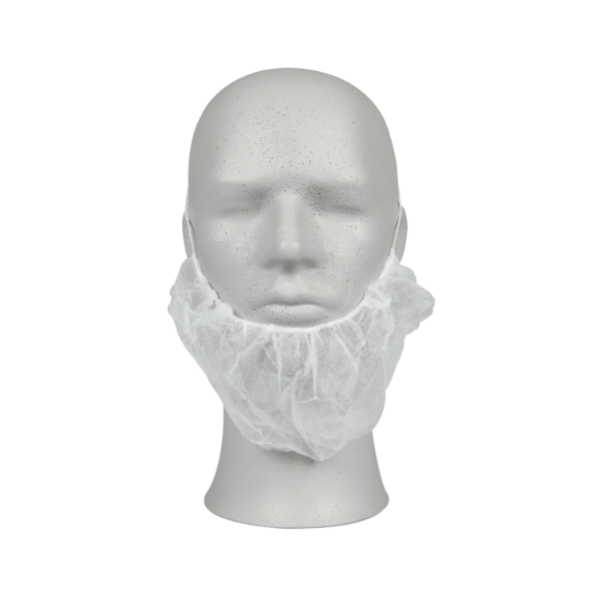 Joustavilla korvalenkeillä varustettu kertakäyttöinen partasuojus ympäristöihin, joissa hygieniastandardit ovat tiukkoja, esimerkiksi elintarvikkeiden valmistuksessa, tuotannossa tai tuotteiden pakkauksessa.