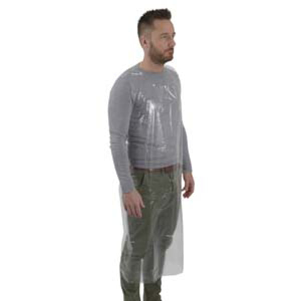 Kertakäyttöinen muoviesiliina, jossa niskalenkki ja taakse solmittavat vyötärönauhat. Pakattu pahviseen rasiaan, joka mahtuu esim. käsinerasioille tarkoitettuun telineeseen.