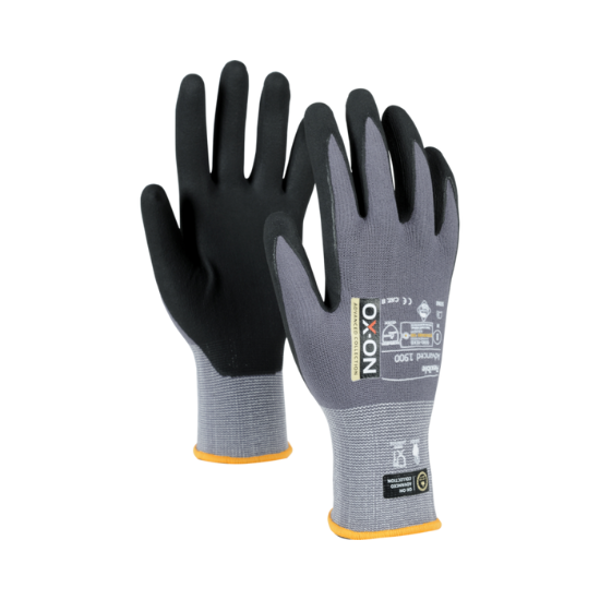 OX-ON Flexible Advanced 1900 on huippulaatuinen yleiskäsine. Se on hyväksytty elintarvikekäyttöön ja toimii lisäksi kosketusnäyttöjen kanssa, joten voit käyttää matkapuhelinta, tablettia ja muita näyttöjä ottamatta käsinettä pois. Käsine on erittäin kestävä ja istuu kuin sinulle tehty mittatilaustuote. Täydellisen istuvuuden ansiosta käsinettä on erittäin mukava käyttää päivästä toiseen ja työtehtävästä riippumatta. Käsine on neulottua nailonia ja elastaania ja siksi erittäin hyvin hengittävä. Luonnollisesti se on joustava ja mukava yllä. Kämmen- ja sormiosat on päällystetty erityisen laadukkaalla nitriilivaahdolla, joka säilyttää sormien tuntoherkkyyden. Tällä käsineellä saat tarkan ja turvallisen otteen esineestä kuin esineestä. Advanced 1900 -käsine on ÖkoTex-sertifioitu, mikä takaa, että käsine ei sisällä terveydelle tai ympäristölle vaarallisia kemikaaleja tai väriaineita. Käsine on myös käsitelty Sanitized-menetelmällä, joten se tuntuu raikkaalta pidempään ja suojaa sinua bakteereilta ja hikoilun hajulta. Kestävyyttä lisää se, että käsine voidaan pestä kahdesti 40 asteessa ja kuivata rumpukuivauksella alhaisissa lämpötiloissa käsineen ainutlaatuisia ominaisuuksia menettämättä.