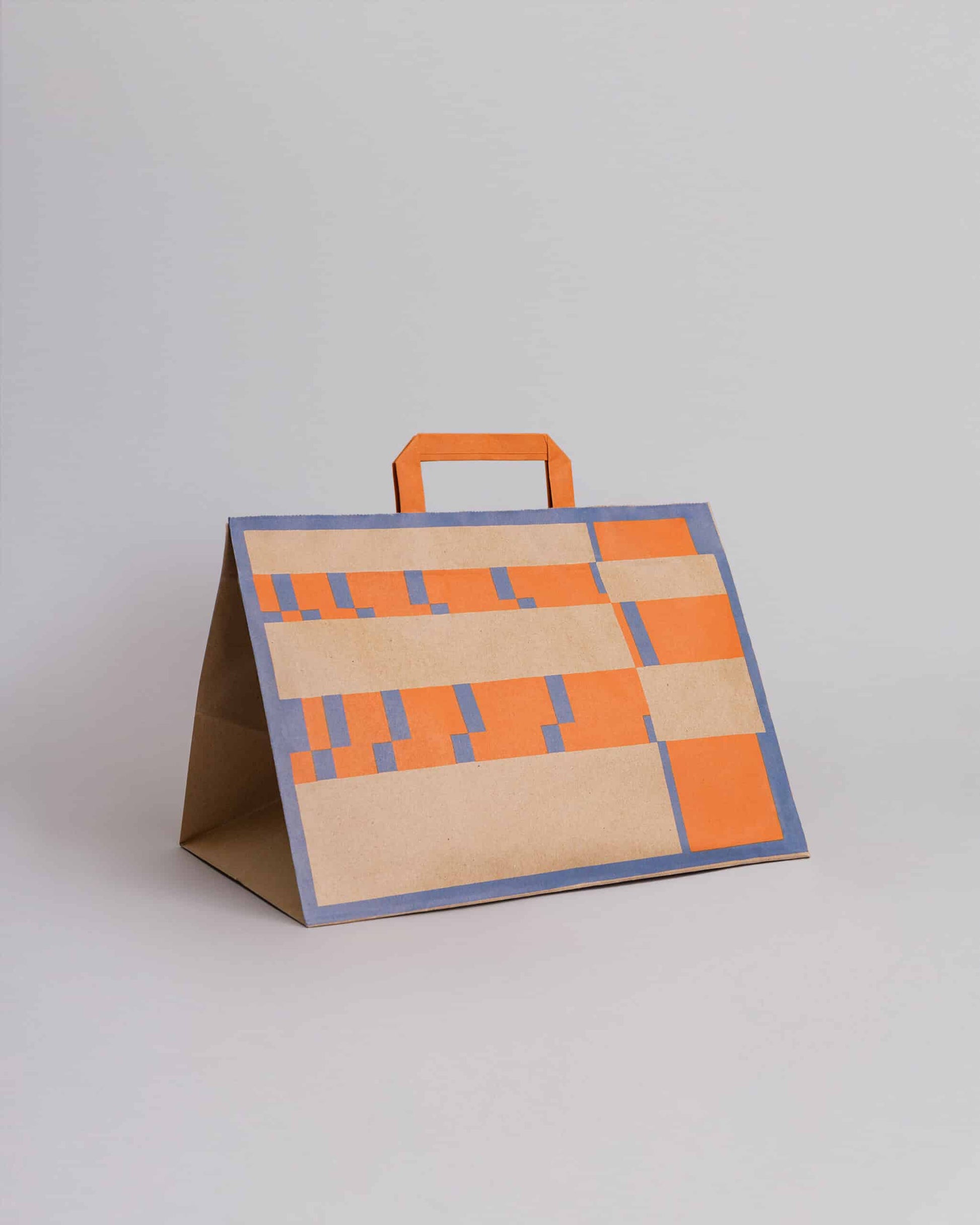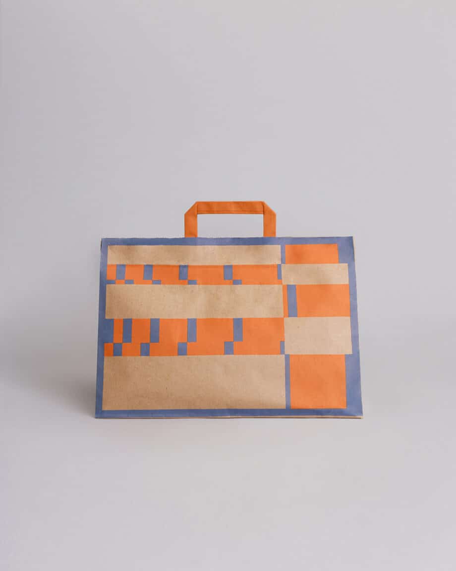 Laadukkaasta voimapaperista valmistettu tukeva paperikassi värikkäällä kuviolla ja kahvoilla.